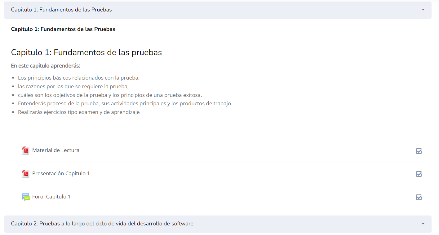 Hola, pasaba por aquí para comentar que aún no tengo disponible la prueba correspondiente a la finalización del capítulo 1. Entendí que al término de cada unidad, se habilitaría un ítem para realizar una prueba en la sección de adjuntos del capítulo